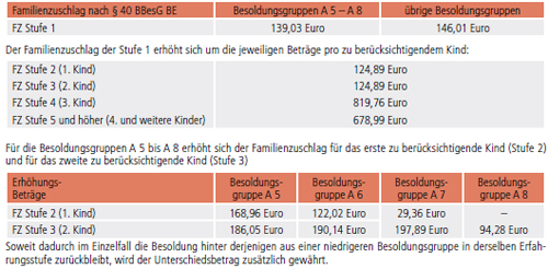 | Familienzuschlag nach § 40 BBesG BE | Besoldungsgruppen A 5 - A 8 | übrige Besoldungsgruppen |